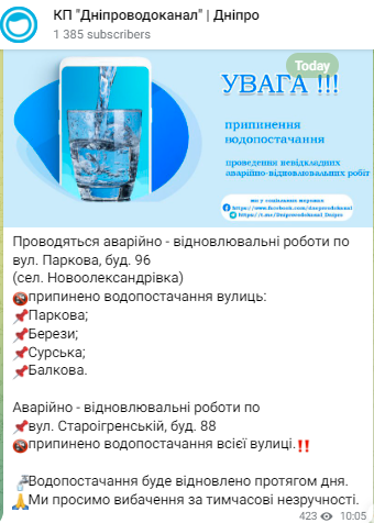 Так, у зв'язку з проведенням аварійно-відновлювальних робіт на вул. Парковій, 96 (сел. Новоолександрівка); вул. Староігренській, 88; вул. Генерала Пушкіна, 1а припинено водопостачання: