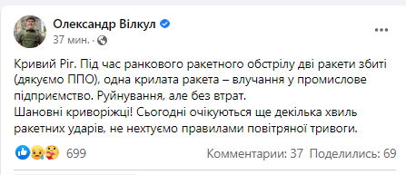 Сьогодні очікуються ще декілька хвиль ракетних ударів, не нехтуємо правилами повітряної тривоги, - написав він.