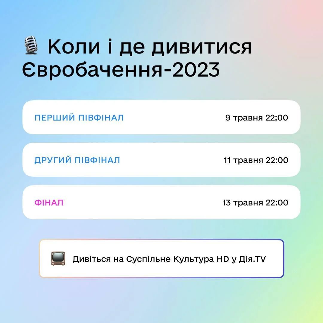 У «Дії» розмістили й графік трансляцій «Євробачення». Відомо, що перший півфінал пройде 9 травня. Другий півфінал — 11 травня. Фінал конкурсу відбудеться 13 травня.