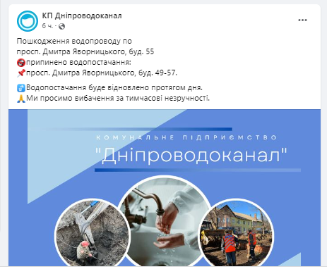 Крім того, через пошкодження водопроводу на просп. Дмитра Яворницького, 55 припинено водопостачання: