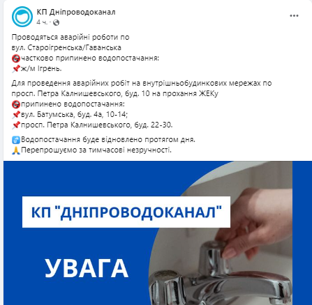 Так, у зв'язку з проведенням аварійних робіт на вул. Староігренській/Гаванській та просп. Петра Калнишевського, 10 припинено водопостачання: