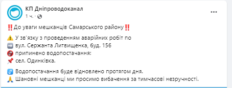 Крім того, у зв'язку з проведенням аварійних робіт на вул. Сержанта Литвищенка, 156 припинено водопостачання: