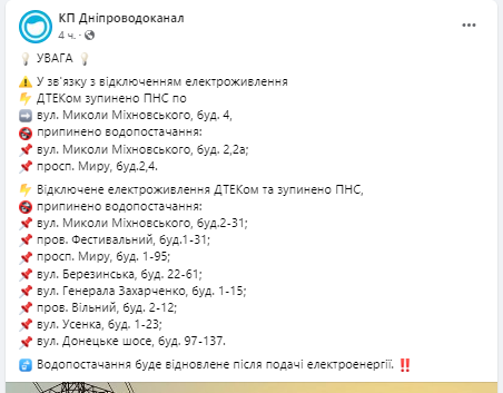 Так, у зв'язку з відключенням електроживлення зупинено ПНС на вул. Миколи Міхновського, 4.