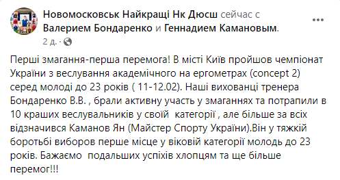 «Наші вихованці тренера В. Бондаренко брали активну участь у змаганнях та потрапили в 10 краших веслувальників у своїй категорії , але більше за всіх відзначився майстер спорту Ян Каманов. Він у тяжкій боротьбі виборов перше місце у віковій категорії молодь до 23 років», - йдеться у повідомленні.