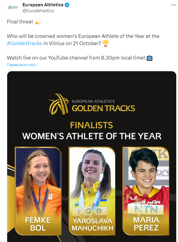 Про це повідомили на сторінці European Athletics у соцмережі.