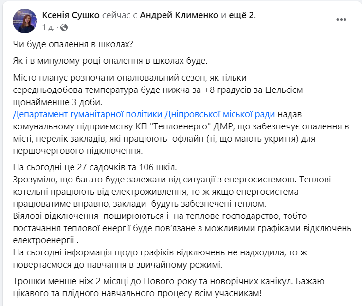 Департамент гуманітарної політики Дніпровської міської ради надав комунальному підприємству КП "Теплоенерго", що забезпечує опалення в місті, перелік закладів, які працюють офлайн (ті, що мають укриття) для першочергового підключення. На сьогодні це 27 садочків та 106 шкіл. Зрозуміло, що багато буде залежати від ситуації з енергосистемою. Теплові котельні працюють від електроживлення, то ж якщо енергосистема працюватиме вправно, заклади будуть забезпечені теплом, - зазначила Сушко.