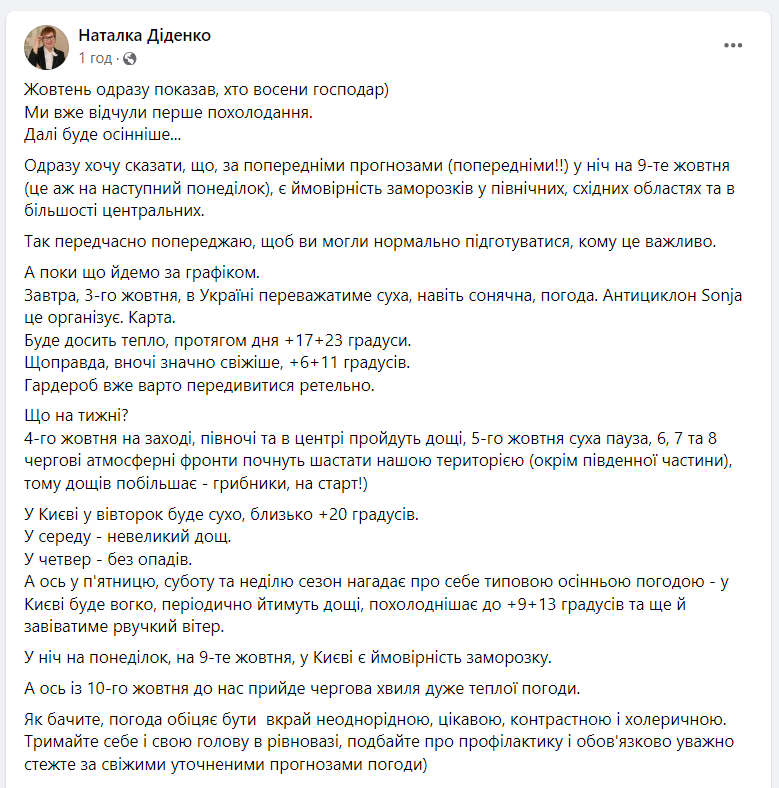 Жовтень одразу показав, хто восени господар. Ми вже відчули перше похолодання. Далі буде осінніше... Одразу хочу сказати, що, за попередніми прогнозами (попередніми!!), у ніч на 9 жовтня (це аж на наступний понеділок) є ймовірність заморозків у північних, східних областях та в більшості центральних, - зазначила синоптик.