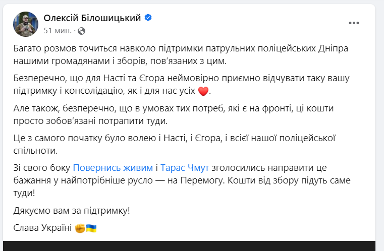 В умовах тих потреб, які є на фронті, ці кошти просто зобовʼязані потрапити туди. Це з самого початку було волею і Насті, і Єгора, і всієї нашої поліцейської спільноти. Зі свого боку "Повернись живим" і Тарас Чмут зголосились направити це бажання у найпотрібніше русло — на Перемогу. Кошти від збору підуть саме туди! Дякуємо вам за підтримку! - написав він.