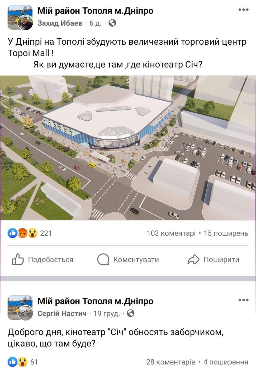 У пресрелізі йшлося про те, що ТЦ буде неподалік нового ЖК "Тополь Town", який зводять на Запорізькому шосе. Чи змінилися плани - дізнаємося згодом. Ясно те, що кінотеатру "Січ" у Дніпрі більше не буде. Утім у мешканців району з'явиться місце, де можна відпочити, хоча і не так, як в "Січі".