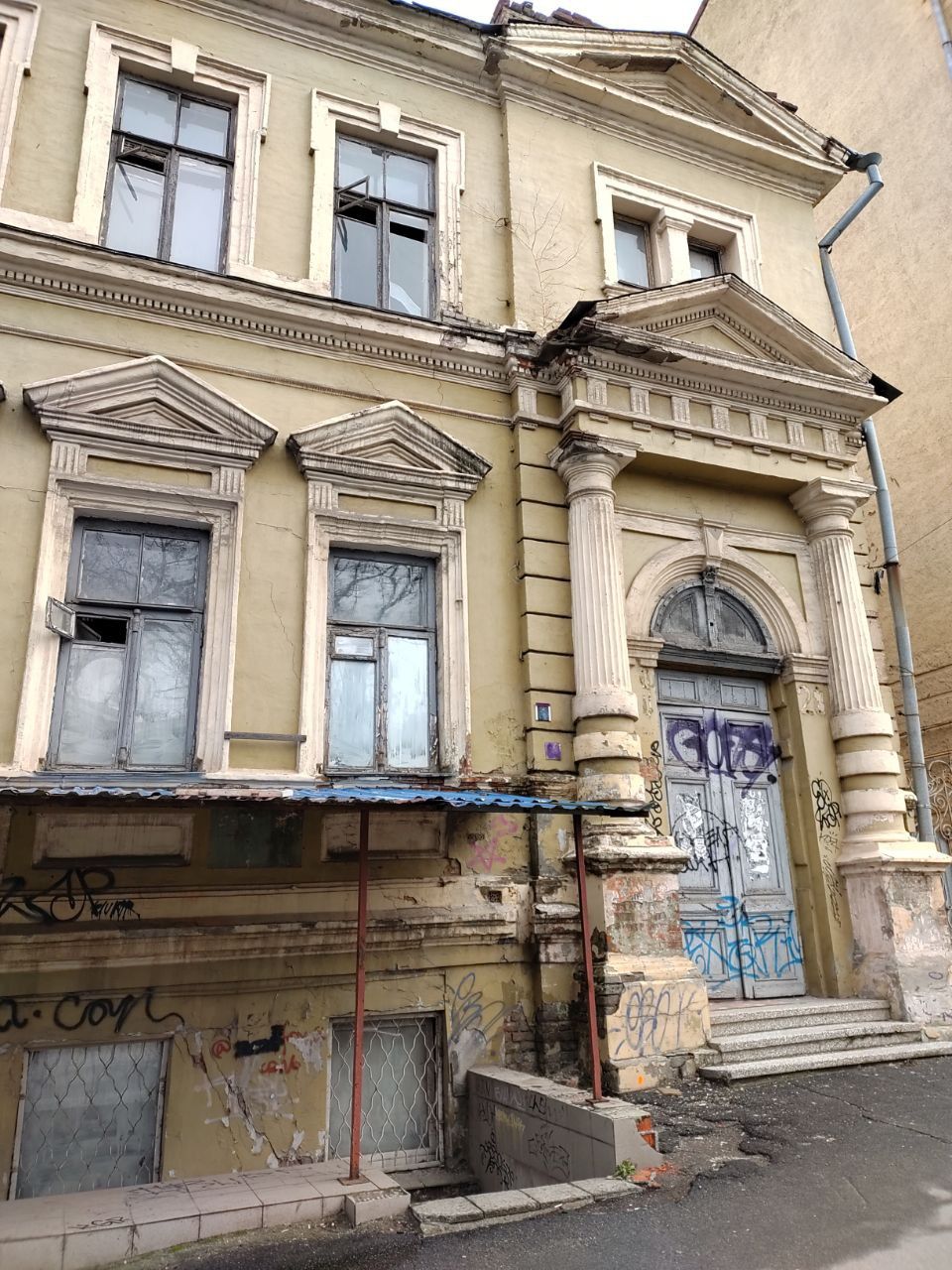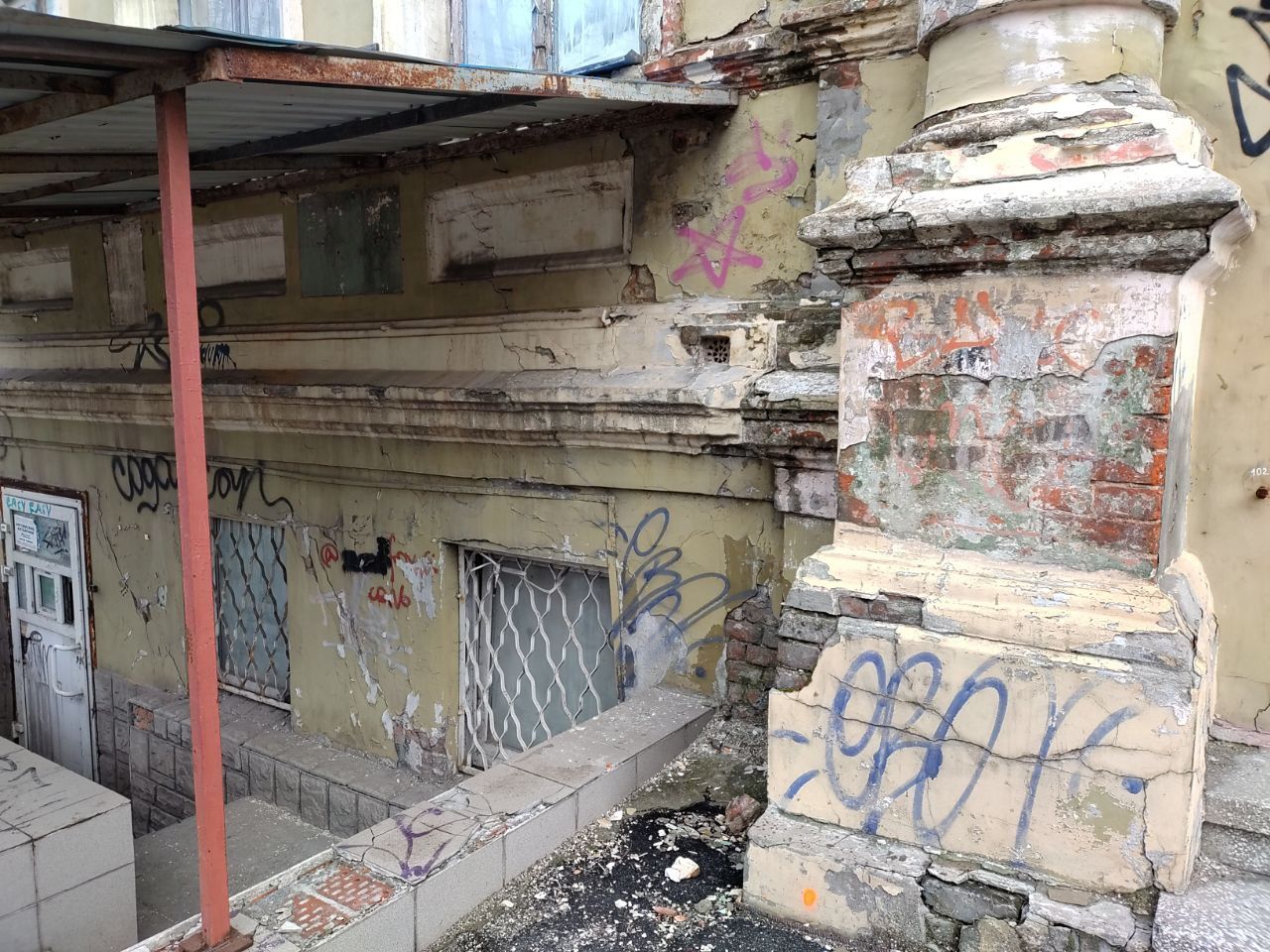 Фасад будівлі виглядає облізлим, облупленим. Ліпнина обсипається. Що раніше тут було – невідомо. Вже близько 10 років воно стоїть занедбаним.