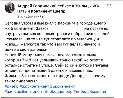 Сьогодні вранці я виїжджав з паркінгу ЖК "5-й континент". Завгосп не пускав усередину сховатися під час тривоги людей, кажучи, що там стоять авто по мільйону і мешканці скаржаться, мовляв, що вам тут робити нічого і йдіть у свої панельки. Через 15 хвилин моя сім'я, два маленькі сини, яким 7 і 8 років, отримали таку саму відповідь і залишилися стояти на вулиці. Зараз вони страшенно налякані від свисту ракети, що пролітала, і вибухів, - написав чоловік.