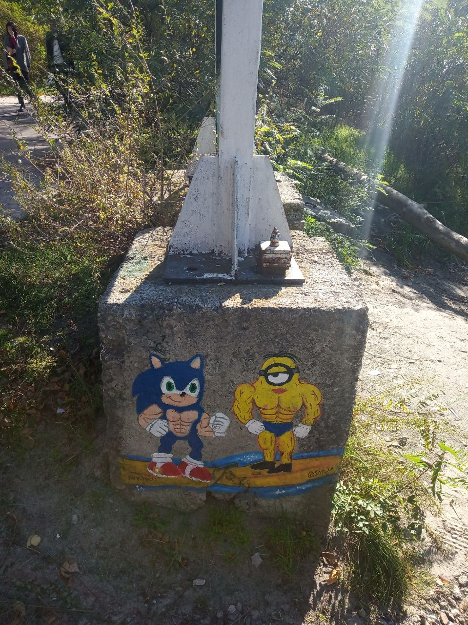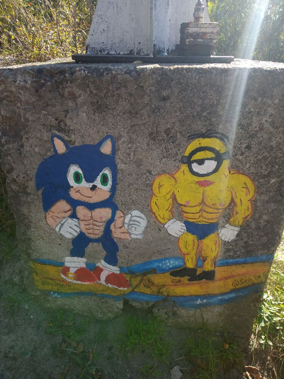 Виглядає графіті дуже стильно та патріотично. На ньому зображені відомі усім мультиплікаційні герої - Сонік та посіпака Стюарт, але автори перетворили їх на силачів. До того ж персонажі намальовані патріотичними кольорами - синім та жовтим.