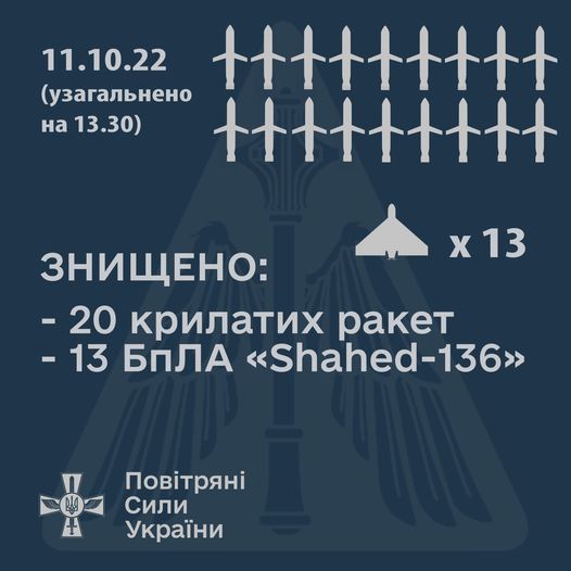 UPD: пізніше командування Повітряних сил ЗСУ уточнило інформацію: всього наші захисники сьогодні вранці збили 20 крилатих ракет та 13 БпЛА-камікадзе «Shahed-136». Також командування повідомило, якими ракетами атакували росіяни сьогодні Україну. Загалом противник здійснив 28 пусків крилатих ракет: 16 ракет Х-101/Х-555 та 12 ракет «Калібр».