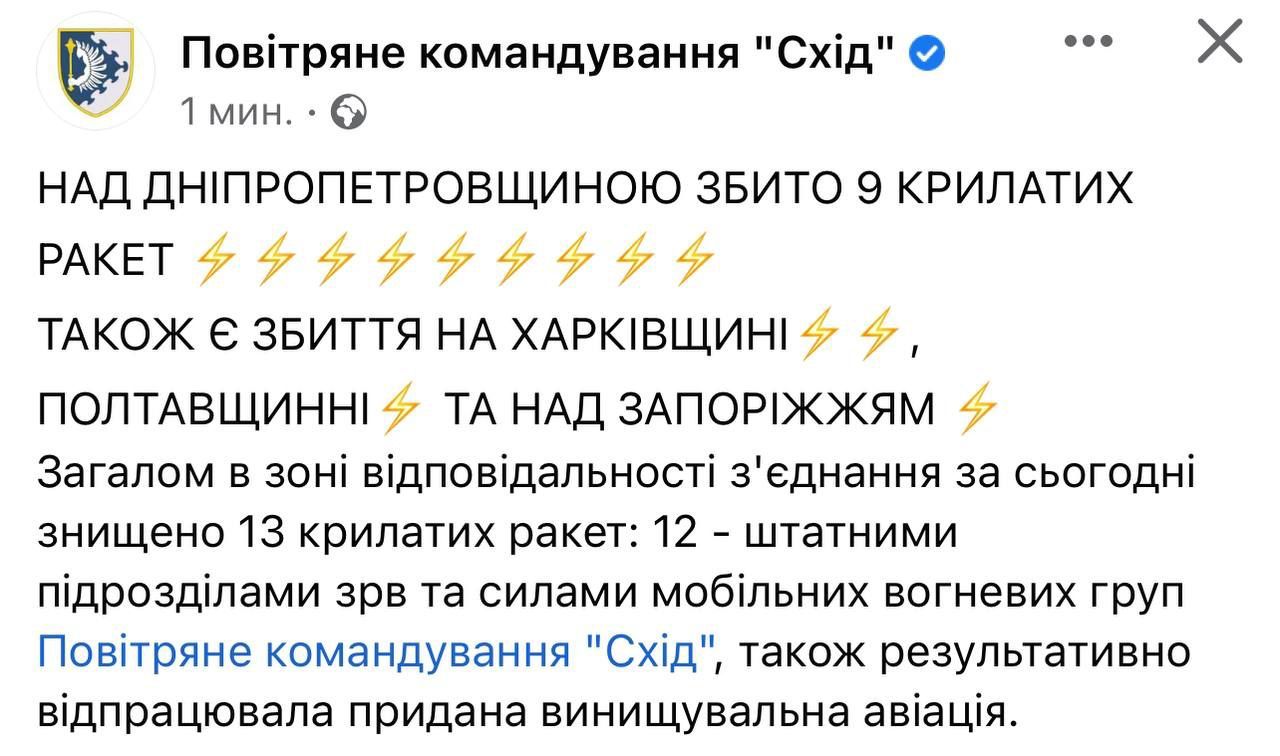 Так, за даними від Повітряного командування Схід над Дніпропетровщиною збили 9 крилатих ракет.