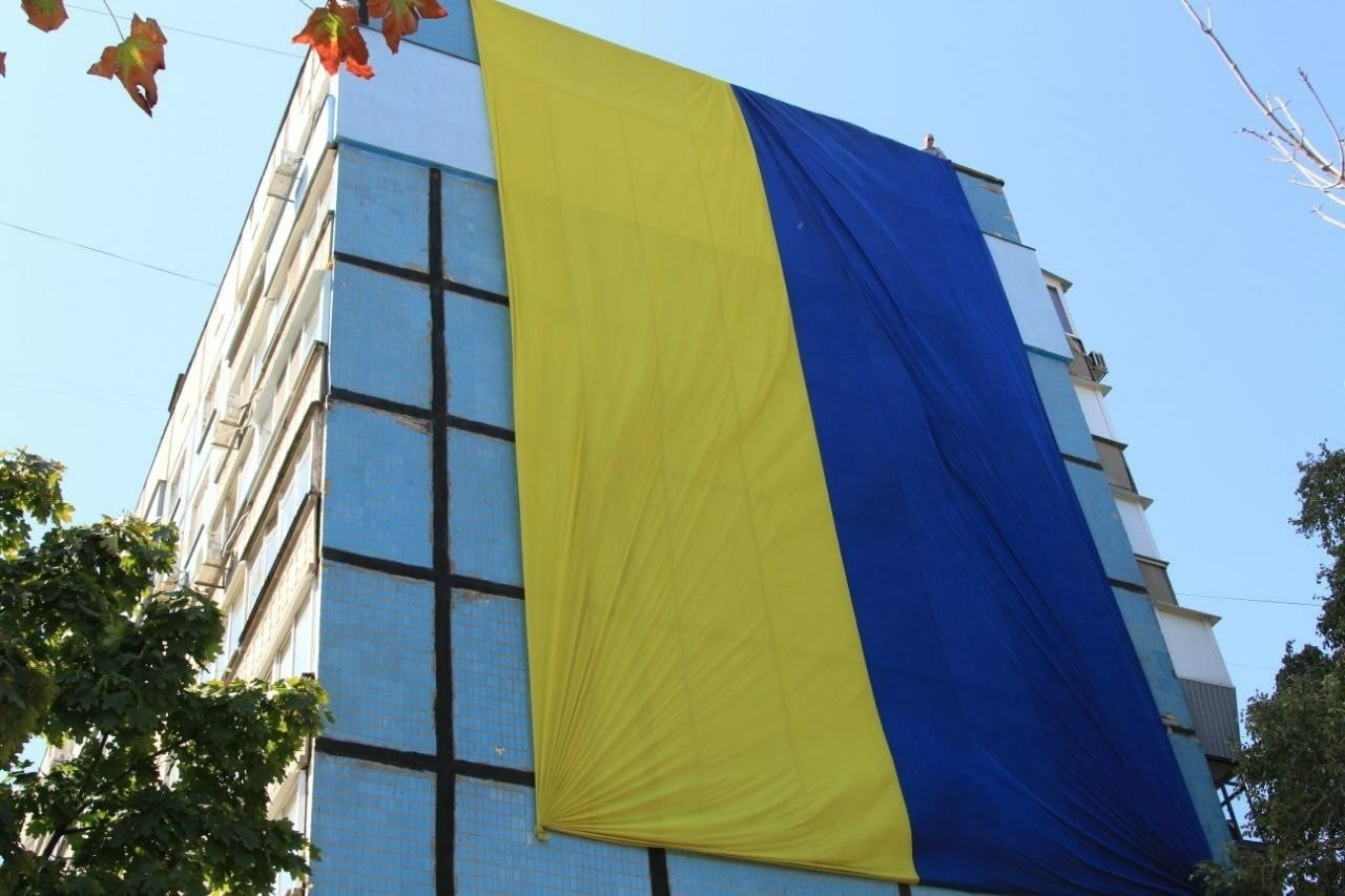 Державний прапор завдовжки 18 метрів та завширшки 12 метрів розмістили мешканці будинку – як символ свободи, незалежності та Перемоги.