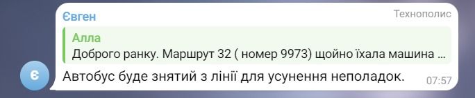 Пізніше представник перевізника ТОВ "Технополіс" відреагував на скаргу та зазначив, що "автобус буде знятий з лінії для усунення неполадок".