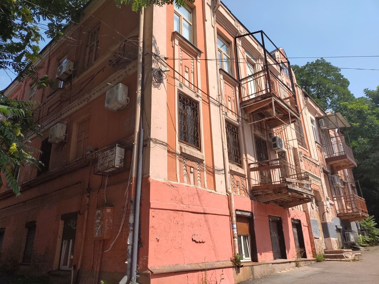 Зовні будівля виглядає не надто презентабельно - штукатурка фасаду, що десь облупилася, закладені вікна з ґратами, балкони в аварійному стані і різний колір фасаду.