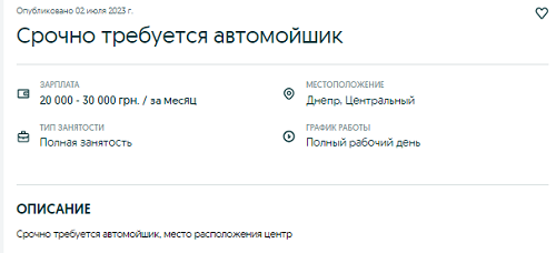 Від 20 до 30 тис грн на місяць може заробити автомийник. Працювати потрібно буде повний робочий день, за графіком автомийки. Інші подробиці здобувач може дізнатися по телефону.
