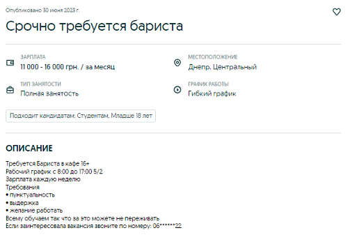 У кафе Дніпра терміново потрібний барист. Вік претендента може бути від 16 років. серед вимог – пунктуальність, витримка та бажання працювати. Як робити каву у різних її варіаціях та інші напої обіцяють навчити на місці. Як зазначено в оголошенні, зарплата баристи становить від 11 до 16 тис грн, а платитимуть щотижня. Буде повна зайнятість з 8 ранку до 17 вечора.