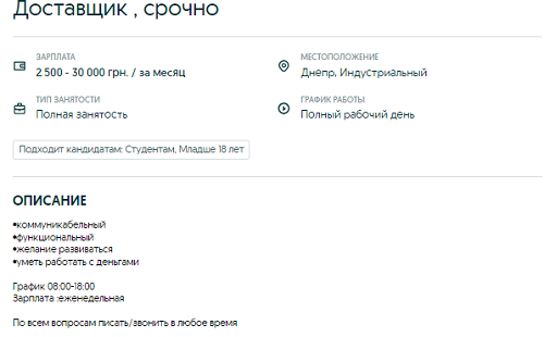 Від 2,5 до 30 тис грн на місяць можна заробити працюючи доставником у Дніпрі. Що потрібно буде доставляти – розкажуть телефоном. Від претендента головне - це бути комунікабельним, функціональним, мати бажання розвиватися та вміти працювати з грошима. Зарплату обіцяють платити щотижня, графік роботи з 8:00 до 18:00.