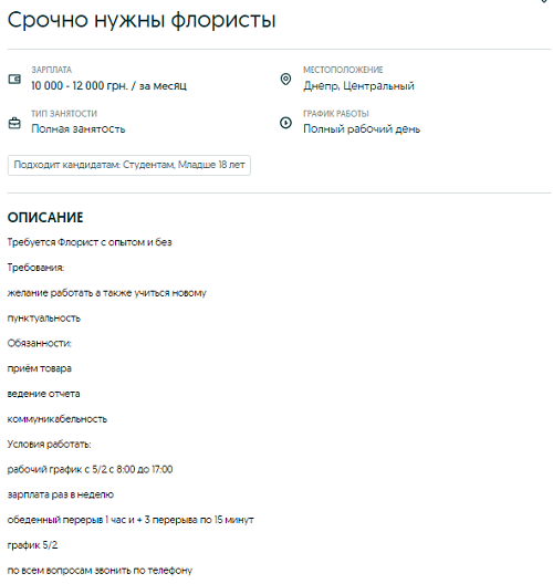 Флорист у Дніпрі може заробити від 10 до 12 тис. грн. Компанії терміново потрібен співробітник з досвідом чи без, серед вимог – пунктуальність, бажання навчатись. Серед обов'язків – прийом товару, ведення звіту, комунікабельність. Умови роботи стандартні – 5 днів на тиждень, з 8 ранку до 17 вечора. Є перерва – одна година і ще три маленькі по 15 хвилин.