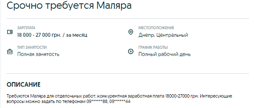 Підприємству терміново потрібні маляри. Платити готові від 18 до 27 тис. грн за зміну. Потрібно буде займатися оздоблювальними роботами, працювати потрібно буде повний робочий день.