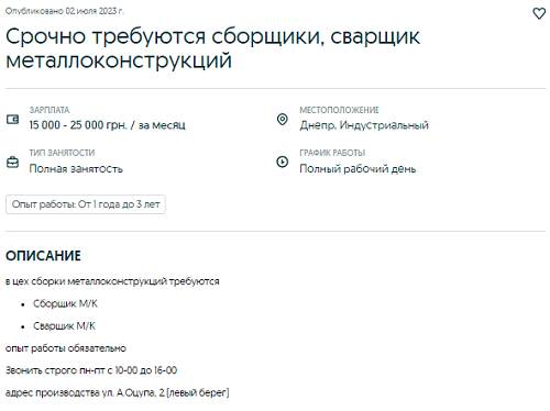 У Дніпрі терміново шукають фахівців зі збирання та зварювання металоконструкцій. Працювати потрібно буде повний робочий день, зарплату обіцяють від 15 до 25 тис. грн на місяць. Досвід роботи у претендентів обов'язковий.