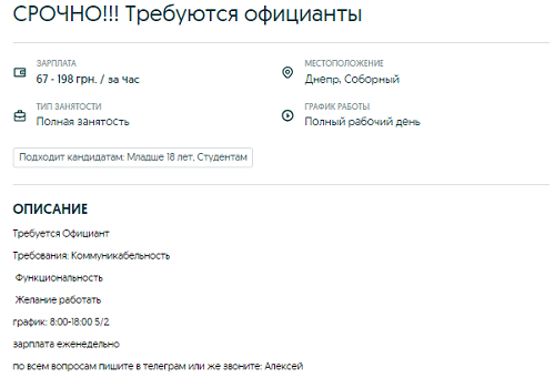 Від 67 до 198 грн за годину можна заробити у Дніпрі, якщо відгукнутися на термінову вакансію з пошуку офіціантів. Графік роботи з 8 ранку до 18 вечора, працювати слід 5 днів на тиждень, зарплату платитимуть щотижня.