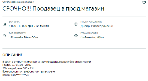 У продуктовий магазин терміново шукають продавця. Графік роботи змінний, працювати доведеться з 7:6 до 20:00, зарплату обіцяють видавати щодня, зміна – 500 грн плюс 1% від продажу. За місяць у такий спосіб на цій терміновій роботі можна заробити від 8 до 10 тис грн.