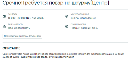 Також терміново у Дніпрі потрібна людина, яка вміє робити шаурму, але якщо є просто бажання працювати шаурмістом, а досвіду немає – роботодавець обіцяє навчити. Працювати треба буде на стаціонарному місці, не в кіоску. За місяць можна буде заробити від 14 до 20 тис. грн.