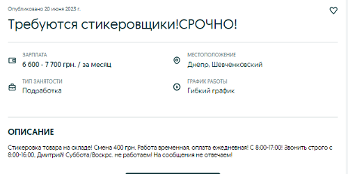 Для стікерування товару на складі у Дніпрі терміново потрібні стікерувальники. Робота позмінна, оплату обіцяють щоденну. Одна зміна оцінюється у 400 грн. За місяць можна заробити від 6 до 7 тис. грн.