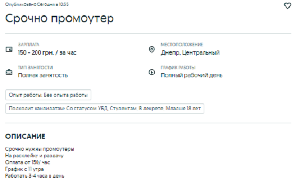 Дуже терміново в Дніпрі шукають промоутера на розклеювання оголошень та роздачу листівок. Платити обіцяють у середньому від 150 до 200 грн. за годину. Зайнятість складає до 4-х годин. Досвід роботи не потрібний.