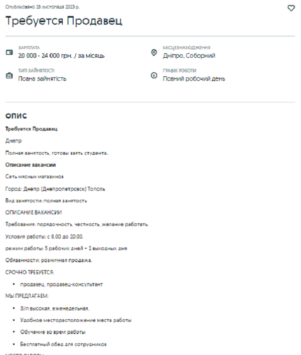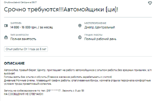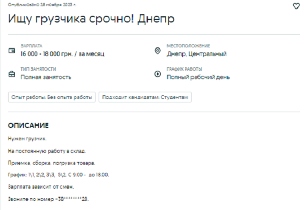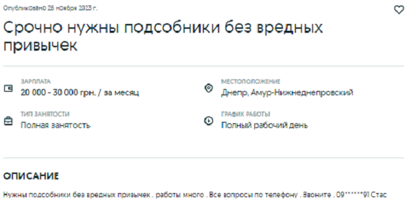 У Дніпрі відкрито вакансію підсобника. Платити обіцяють від 20 до 30 тис грн на місяць. Головне від претендента – відсутність шкідливих звичок. Працювати потрібно буде повний робочий день. Усі подробиці обіцяють повідомити телефоном.