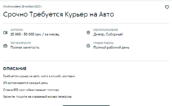Також терміново потрібен кур'єр на авто в службу доставки. Зарплату обіцяють платити щодня. Працювати потрібно буде повний робочий день. Ставка – 850 грн на добу, компенсується паливо та надається обід. Роботодавець обіцяє, що за місяць такий співробітник може заробити від 20 до 30 тис грн.