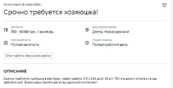 В один із ресторанів Дніпра терміново потрібна господиня. Платити обіцяють до 10 тис грн на місяць. Працювати потрібно буде за графіком 3/3 з 9 ранку до 21:00. Гроші видаватимуться наприкінці кожного робочого дня. Одна зміна оцінюється у 700 грн. Що конкретно потрібно буде робити – розкажуть по телефону або під час зустрічі. Про досвід роботи нічого не сказано.
