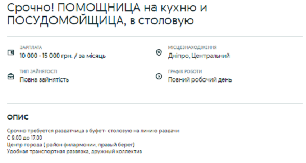 В одну зі їдалень Дніпра потрібна помічниця на кухню, а заодно посудомийниця і роздатниця в буфет. Працювати потрібно з 9 ранку до 17 вечора. Платити обіцяють від 10 до 15 тис грн.