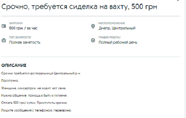 Також терміново потрібна доглядальниця на вахту. Платити обіцяють 500 грн. на добу. Працювати потрібно буде подобово. Суть роботи – догляд за жінкою з коксартрозом. Вона не ходить, їй потрібна допомога у побуті та гігієні.
