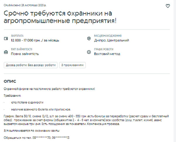 Охоронній фірмі у Дніпрі терміново потрібні охоронці. Працювати треба буде на агропромисловому підприємстві. За місяць обіцяють платити від 12 до 17 тис. грн. Працювати потрібно вахтовим методом 30/10. Одна зміна – 12 годин. Головне від претендента – відсутність судимості, наявність військового квитка чи приписного. Зарплата виплачуватиметься після закінчення вахти, але аванс видається кожні три дні. Є заохочення за показники та компенсація проїзду.