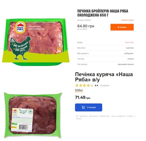 Куряча печінка виробника «Наша Ряба» в «Сільпо» обійдеться 71,69 грн за 650 грам. У «Варусі» за неї просять 64,9 грн. В АТБ курячої печінки цього виробника за даними сайту магазину немає.
