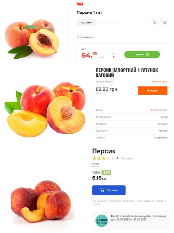 У «Сільпо» діє акція на персики, їх віддають за ціною 61,6 грн за кіло. Без знижки ціна товару становить 70 грн. У «Варусі» найдешевші персики знайшлися за ціною 69,9 грн. за кіло. В АТБ персики за акцією коштують 64,95 грн за кіло, без знижки – 69,9 грн.