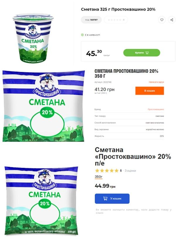 За сметану «Простоквашино» жирністю 20% у «Сільпо» просять 44,99 грн за 350 грам. У «Варусі» вона коштує 41,2 грн. в АТБ сметана «Простоквашино» є, але в іншій упаковці – пластиковому стаканчику та трохи меншої ваги – у ньому 325 грам. Коштує така сметана 45,3 грн