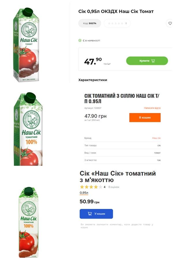 Сік томатний «Наш Сік» у «Сільпо» коштуватиме 50,99 грн за 950 мл. у «Варусі» цей сік коштуватиме 47,9 грн. В АТБ ціна аналогічна вартості соку у «Варусі».