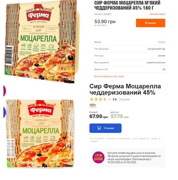 Сир «Ферма» у «Сільпо» коштуватиме 67,99 грн за 180 грам. У «Варусі» він коштує 53,9 грн. В АТБ такого сиру на прилавках немає.