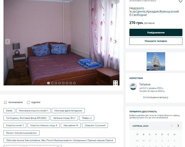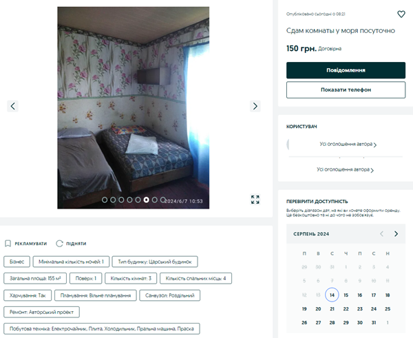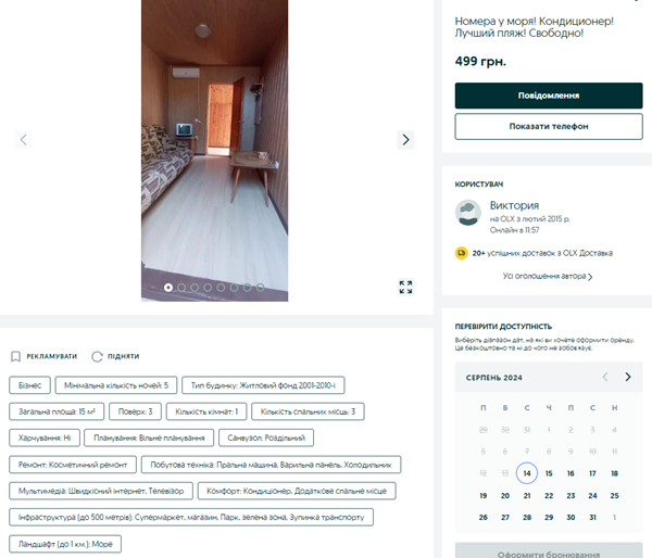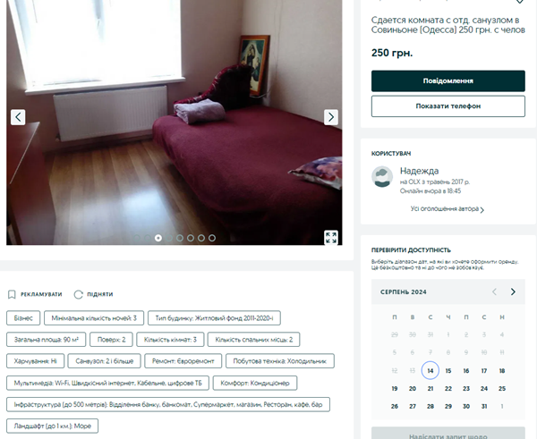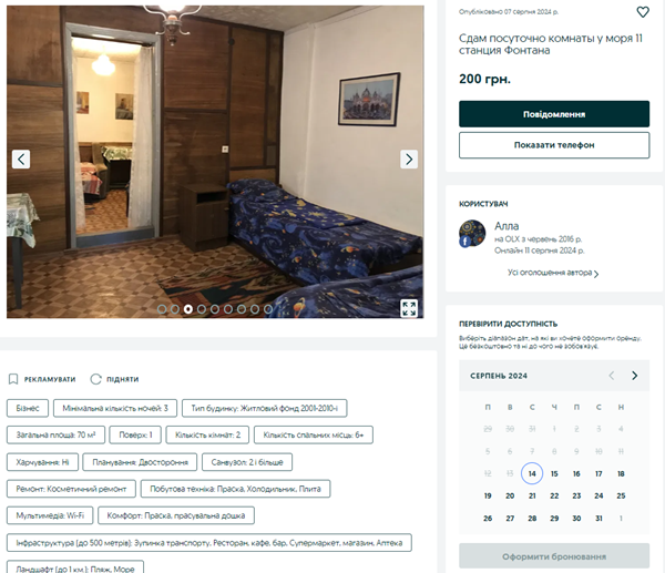 Поруч із пляжем «Чайка» в Одесі (як зазначається, 8 хвилин до нього пішки) можна винайняти кімнату за 200 грн з людини. Є всі зручності: від бездротового інтернету до столика у дворі для відпочинку.