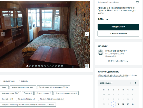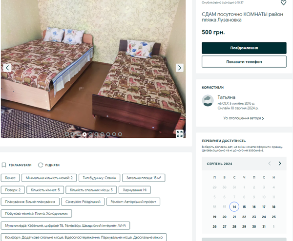 Аналогічну ціну – 500 грн просять за кімнату поряд із пляжем «Лузанівка». Зі зручностей - загальний туалет, душ і кухня. У кімнаті є телевізор, вентилятор та спальне місце.