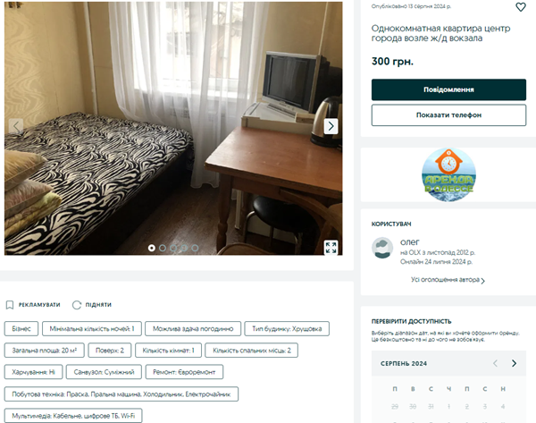 Проживання в однокімнатній квартирі біля вокзалу в Одесі коштуватиме 300 грн з людини. Наскільки далеко вона від моря – невідомо. У квартирі є все, що потрібно: від пральної машинки до чайника. Знаходиться вона на 2 поверсі будинку-«хрущовки».