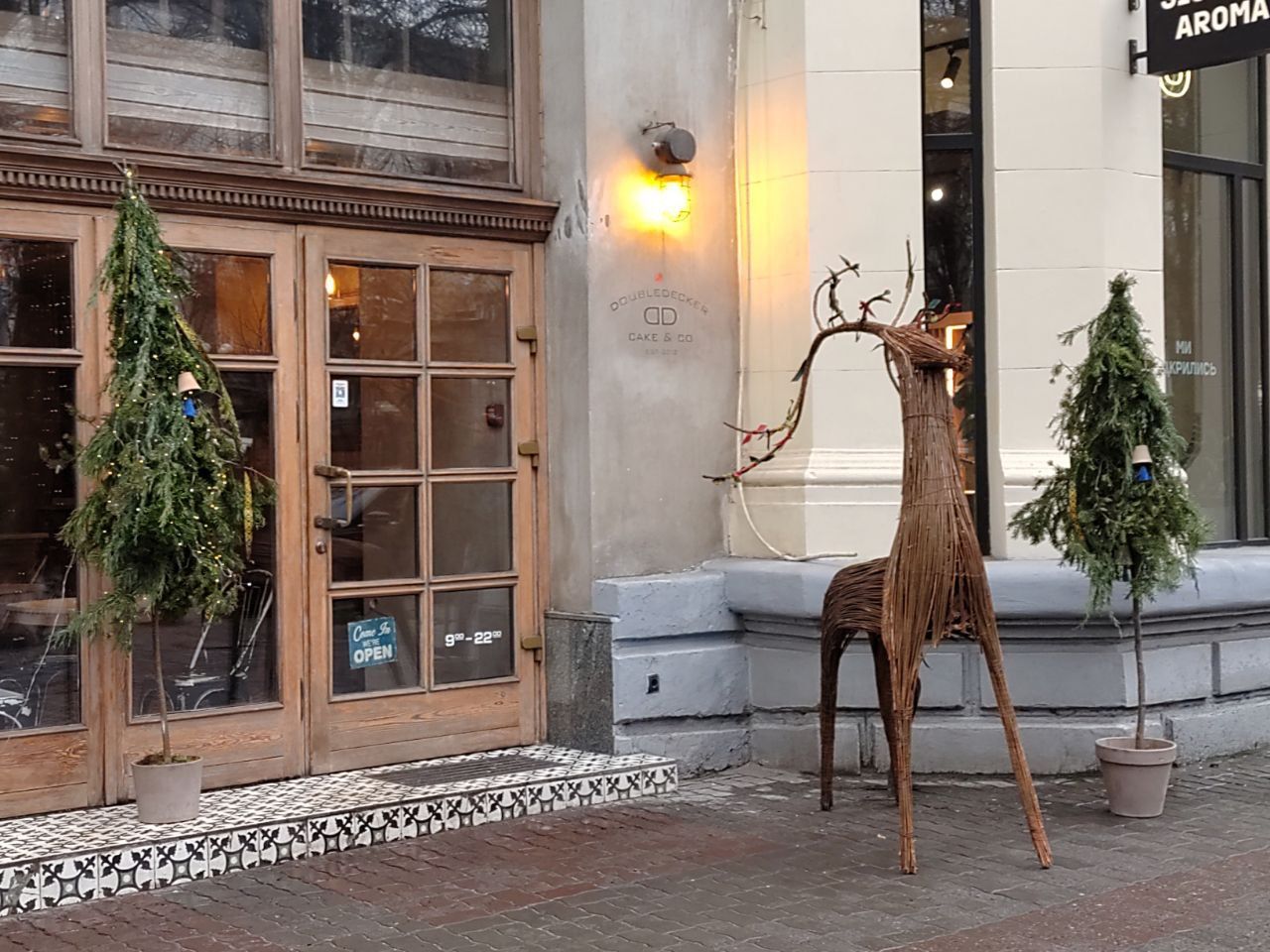 Композицію з кількох новорічних дерев та оленя з лози можна побачити біля ще однієї кондитерської-кав'ярні у Дніпрі – DoubleDecker Cake&Coffee. Тут стоять справжні новорічні дерева у горщиках та практично без прикрас.