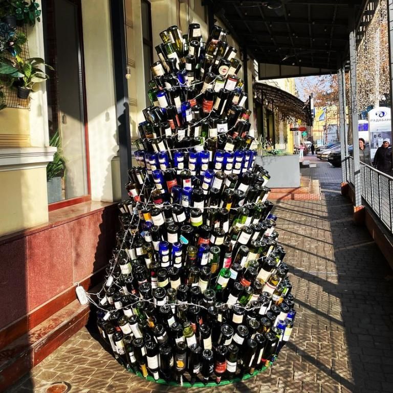 Новорічну ялинку з пляшок вина та іншого алкоголю можна побачити на вулиці Мономаха біля ресторану Casta. Висотою «дерево» майже два метри виглядає дуже незвично. Під час його створення використовувалися порожні пляшки.
