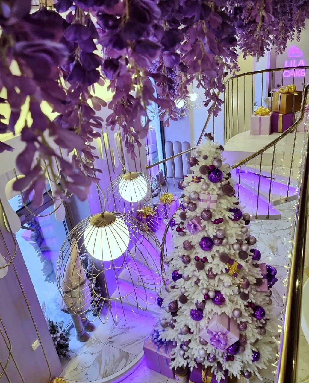 Незвичайна ялинка у фіолетово-білих тонах з'явилася у закладі Lila Cake, що на центральному проспекті Дніпра. Голки ялинки білого кольору і зовні більше нагадують густу мастику або глазур на торті, а вона прикрашена фіолетовими кулями різних відтінків.