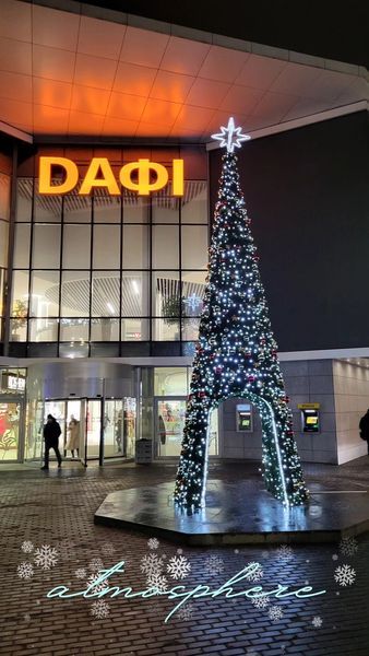 Отак виглядає ялинка біля ТЦ «Дафі». До повномасштабного вторгнення біля цього торговельного центру розміщувалося аналогічне новорічне дерево.
